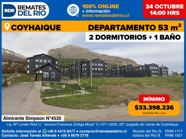 Se remata el Departamento número B-406, ubicado en el cuarto piso del Edificio B del Condominio Lomas de Coyhaique, en Calle Almirante Simpson N°4535, comuna de Coyhaique.