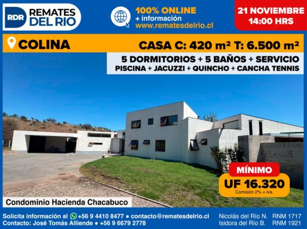 Casa en Condominio Hacienda Chacabuco. La propiedad destaca por sus 420 m² construidos en un extenso terreno de 6.500 m², ofreciendo una distribución de 5 dormitorios, 5 baños mas pieza de servicio. Además, incluye equipamiento de lujo para esparcimiento, como piscina, jacuzzi, quincho y cancha de tenis.