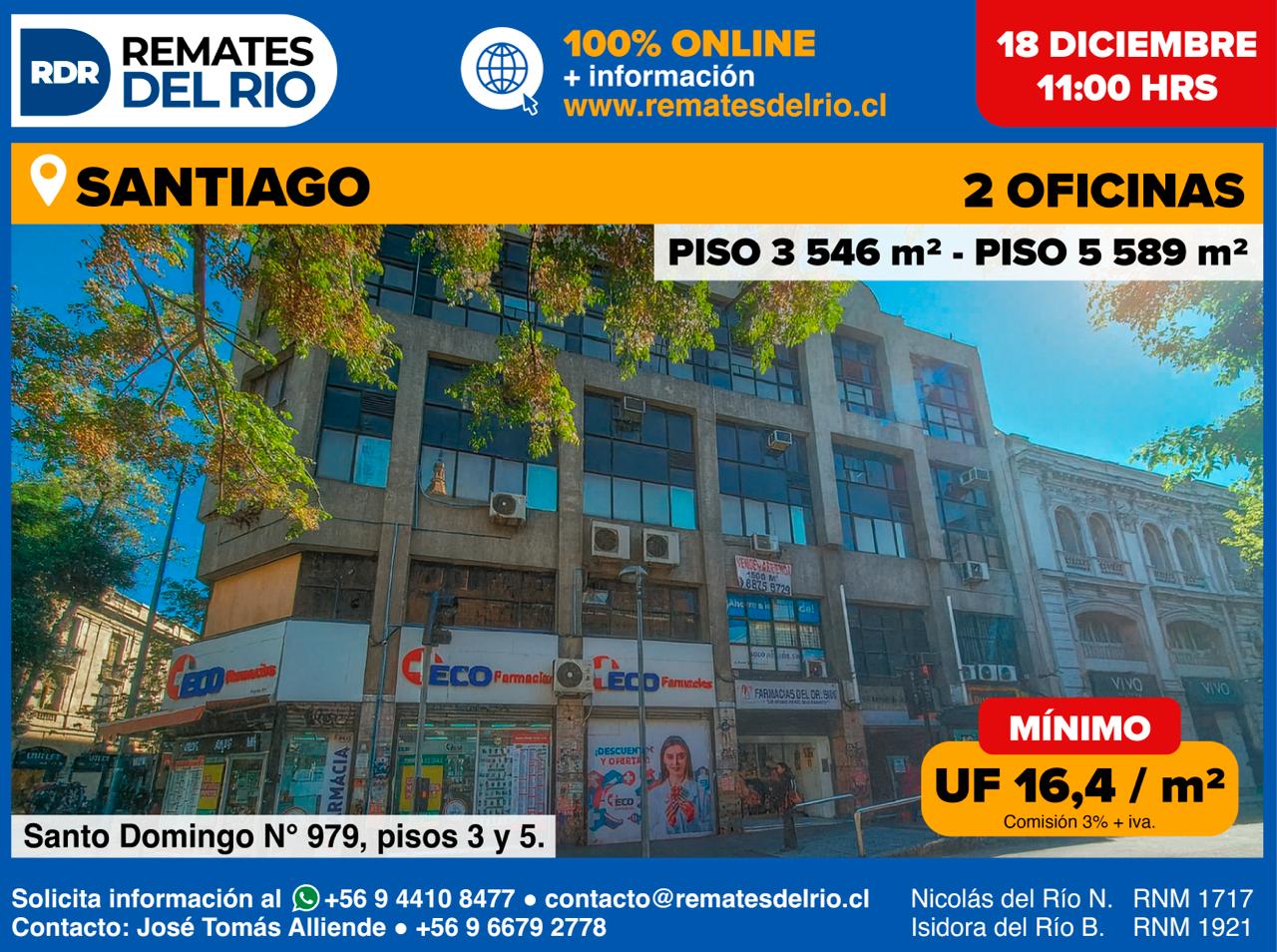 Se ofrecen dos exclusivas oficinas en el mismo edificio, ubicadas estratégicamente en el Barrio Cívico de Santiago Centro (Santo Domingo con Pasaje Puente). Las unidades disponibles son: la Oficina 3, con 546 m², y la Oficina 5, con 589 m².