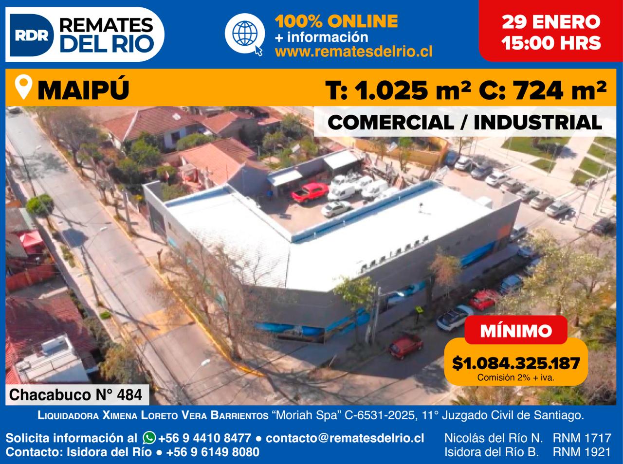 Este inmueble industrial ubicado en Calle Chacabuco N° 484, en el núcleo central de la comuna de Maipú, cuenta con una superficie de terreno de 1.025 m2 y una edificación de 724,67 m2 distribuidos en dos niveles. Su ubicación es altamente estratégica debido a la proximidad con ejes viales de relevancia como Avenida Pajaritos, Avenida 5 de Abril y Camino a Melipilla, además de su excelente conectividad con la Autopista del Sol y Vespucio Sur. El sector se caracteriza por un entorno de uso mixto con un alto flujo peatonal y vehicular, facilitado por el acceso cercano a las estaciones de Metro Plaza de Maipú y Santiago Bueras, y una densa oferta de servicios bancarios, comerciales e institucionales.