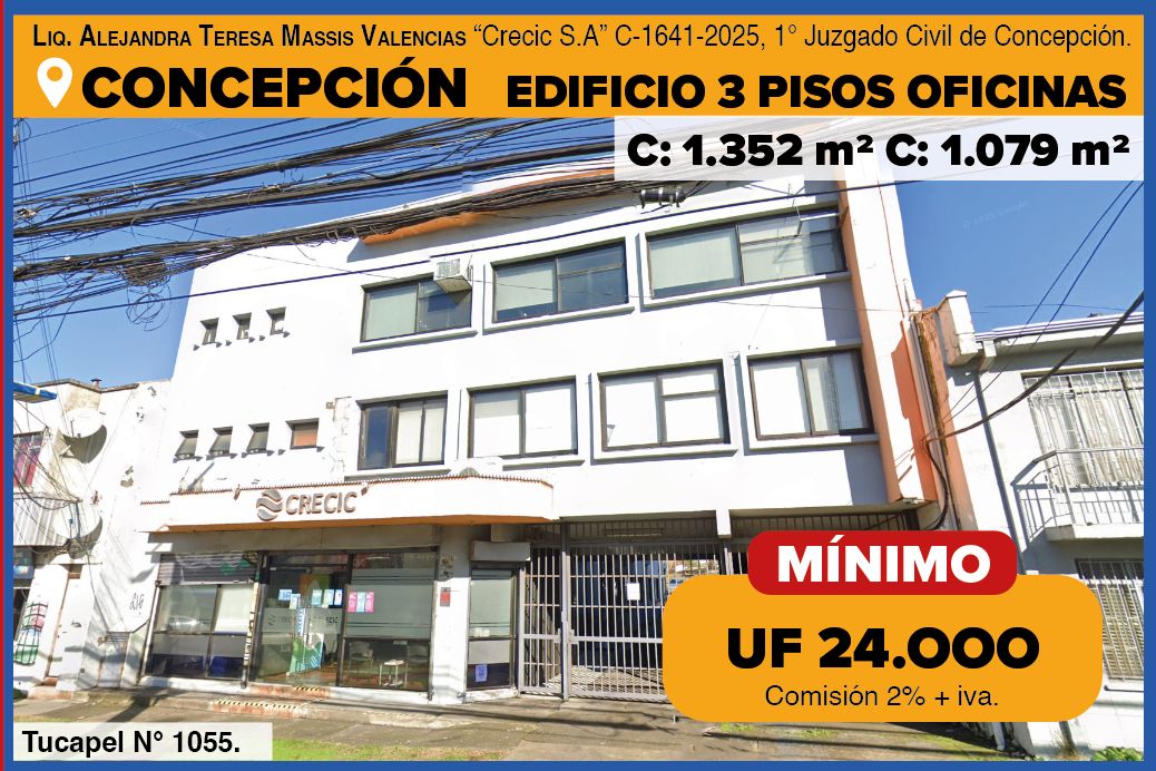 Espectacular edificio de 3 pisos de altura, ubicado en la calle Tucapel 1055, Concepción. Este edificio cuenta con 1079 m2 de terreno, y 1.352 m2 construidos.
