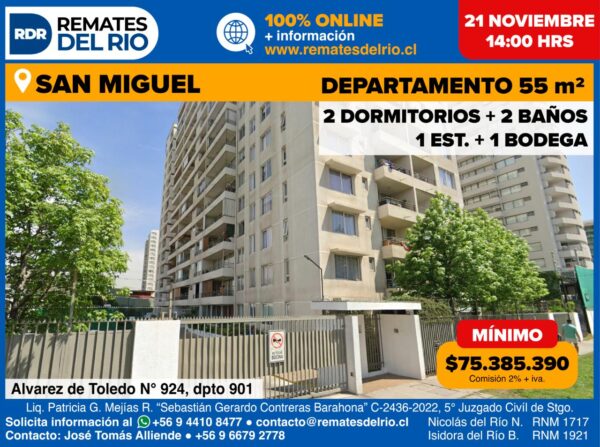 Propiedad de 55 m² que consta de 2 dormitorios y 2 baños completos. Incluye un estacionamiento y una bodega. Está ubicado en Calle Álvarez de Toledo N°924.