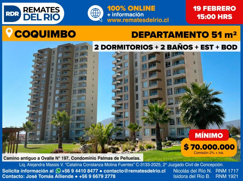 Remate – Departamento + Bodega + Estacionamiento CoquimboCLP$ 70.000.000Camino Antiguo a Ovalle Nº 197Propiedad de 51 m² ubicada en Camino Antiguo a Ovalle Nº 197. El inmueble incluye, además de la unidad habitacional, un estacionamiento y una bodega. Emplazado en el sector de Peñuelas, este departamento destaca por su óptima distribución, privilegiada localización, comodidad y una impresionante vista hacia un entorno natural. Es ideal para quienes buscan residir […]