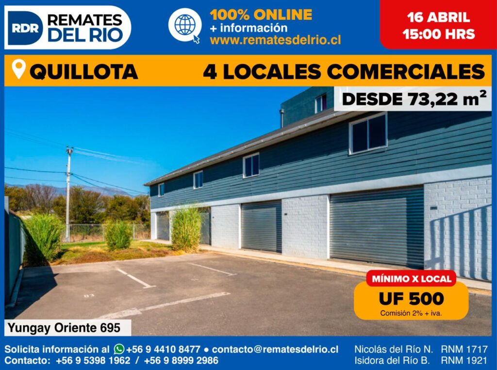 Remate – Cuatro Locales Comerciales En QuillotaUF 500Yungay oriente 695, QuillotaCuatro locales comerciales de dos pisos están disponibles para la venta. Ubicados en la entrada de un complejo residencial en Quillota, cada uno tiene una superficie aproximada de 73,22 m² y cuenta con estacionamientos exclusivos.