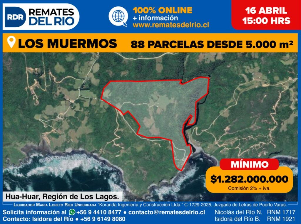 REMATE PROYECTO PARCELACIÓN LOS MUERMOSCLP$ 1.282.000.000Los MuermosSe remata espectacular proyecto de parcelación en Huar Huar, Los muermos. Con 88 parcelas, plano aprobado por el SAG, y roles de avaluo fiscal. Aprovecha esta oportunidad para hacer una inversion inteligente.