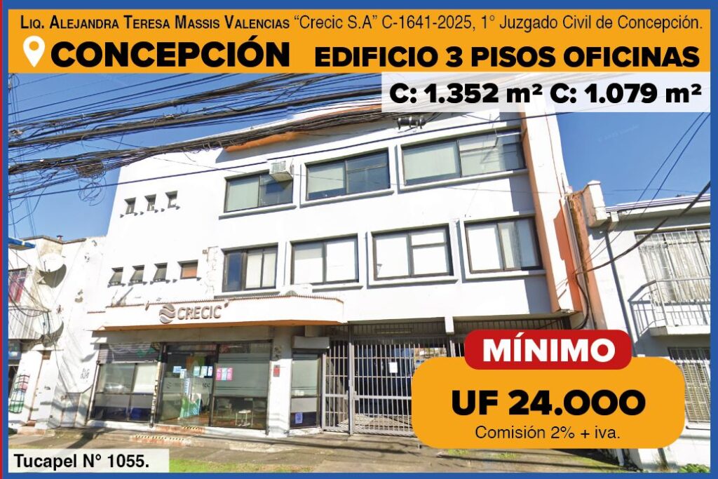 REMATE – EDIFICIO DE OFICINAS CONCEPCIÓNUF 23.999Tucapel 1055, ConcepciónEspectacular edificio de 3 pisos de altura, ubicado en la calle Tucapel 1055, Concepción. Este edificio cuenta con 1079 m2 de terreno, y 1.352 m2 construidos. Tucapel 1055 está en el centro penquista, un eje con alto flujo peatonal/comercial y mezcla de edificaciones clásicas y modernas; la calle Tucapel se describe justamente como parte del […]