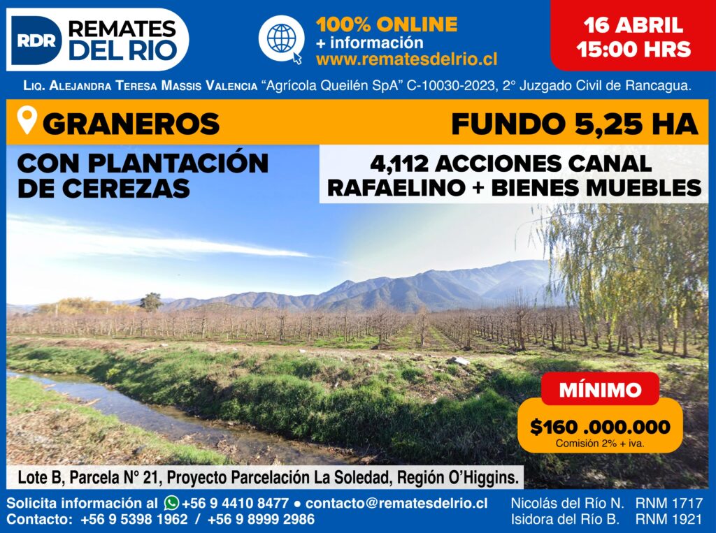 Remate – Fundo GranerosCLP$ 160.000.000Fundo GranerosFundo de 5,2 ha, el cual cuenta con derechos de agua correspondientes a 4,412 acciones del canal Rafaelino. Propiedad se encuentra plantada con cerezos.