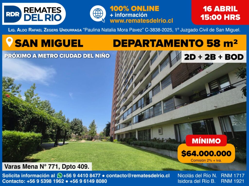REMATE – DEPARTAMENTO EN SAN MIGUELCLP$ 64.000.000Espectacular departamento en la comuna de San Miguel, cercano al metro Ciudad del Niño. Departamento cuenta con 58 m2 construidos, y una tipologia de 2 dormitorios y 2 baños. El edificio cuenta con jardines, piscina, gimnasio, salones de estudio, juegos de niño, entre otros.
