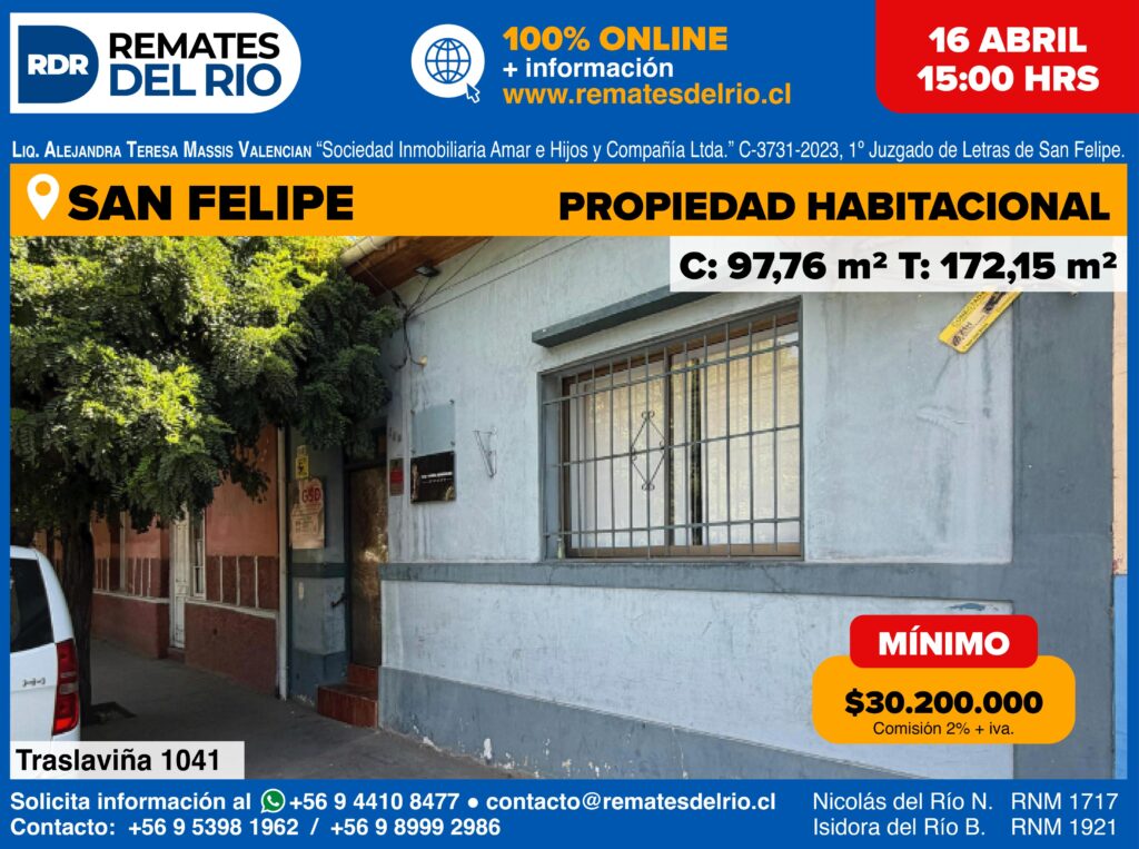 REMATE – TRASLAVIÑA 1041 (EX 129) SAN FELIPECLP$ 30.200.000TRASLAVIÑA 1041 (EX 129) SAN FELIPEInmueble ubicado en la Calle Traslaviña 1041 (ex 129), Comuna de San Felipe, rol de avalúo fiscal n°107-4. Se encuentra inscrito a fojas 1816 N°1941 del Registro de propiedad del CBR de San Felipe correspondiente al año 2005. Propiedad cuenta con 172 m2 de terreno y 98 m2 construidos