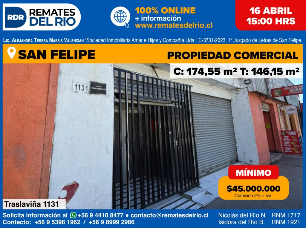 REMATE – CALLE TRASLAVIÑA 1131 (EX 163), SAN FELIPECLP$ 45.000.000CALLE TRASLAVIÑA 1131 (EX 163), SAN FELIPEInmueble ubicado en la Calle Traslaviña 1131 (ex 163), Comuna de San Felipe, rol de avalúo fiscal n°127-4. Se encuentra inscrito a fojas 1618 vuelta N°1756 del Registro de propiedad del CBR de San Felipe correspondiente al año 2005. Propiedad cuenta con 146 m2 de terreno y 175 m2 construidos