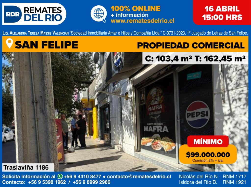 REMATE – TRASLAVIÑA 1186 (EX 190), SAN FELIPECLP$ 99.000.000TRASLAVIÑA 1186 (EX 190), SAN FELIPEInmueble ubicado en la Calle Traslaviña 1186 (ex 190), Comuna de San Felipe, rol de avalúo fiscal n°126-35. Se encuentra inscrito a fojas 1816 N°1941 del Registro de propiedad del CBR de San Felipe correspondiente al año 2005. Propiedad cuenta con 162 m2 de terreno y 103 m2 construidos