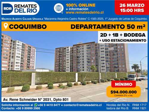 Remate – Departamento en Coquimbo – Condominio Alto HaciendaCLP$ 94.000.000Avenida Rene Schneider 2031Cómodo departamento de 50 m² en el piso 8 (Unidad 801). Cuenta con 2 dormitorios, 1 baño y estacionamiento privado. Ubicación estratégica con excelente conectividad y vista despejada. Ideal para inversión o vida familiar en un sector consolidado de la ciudad.